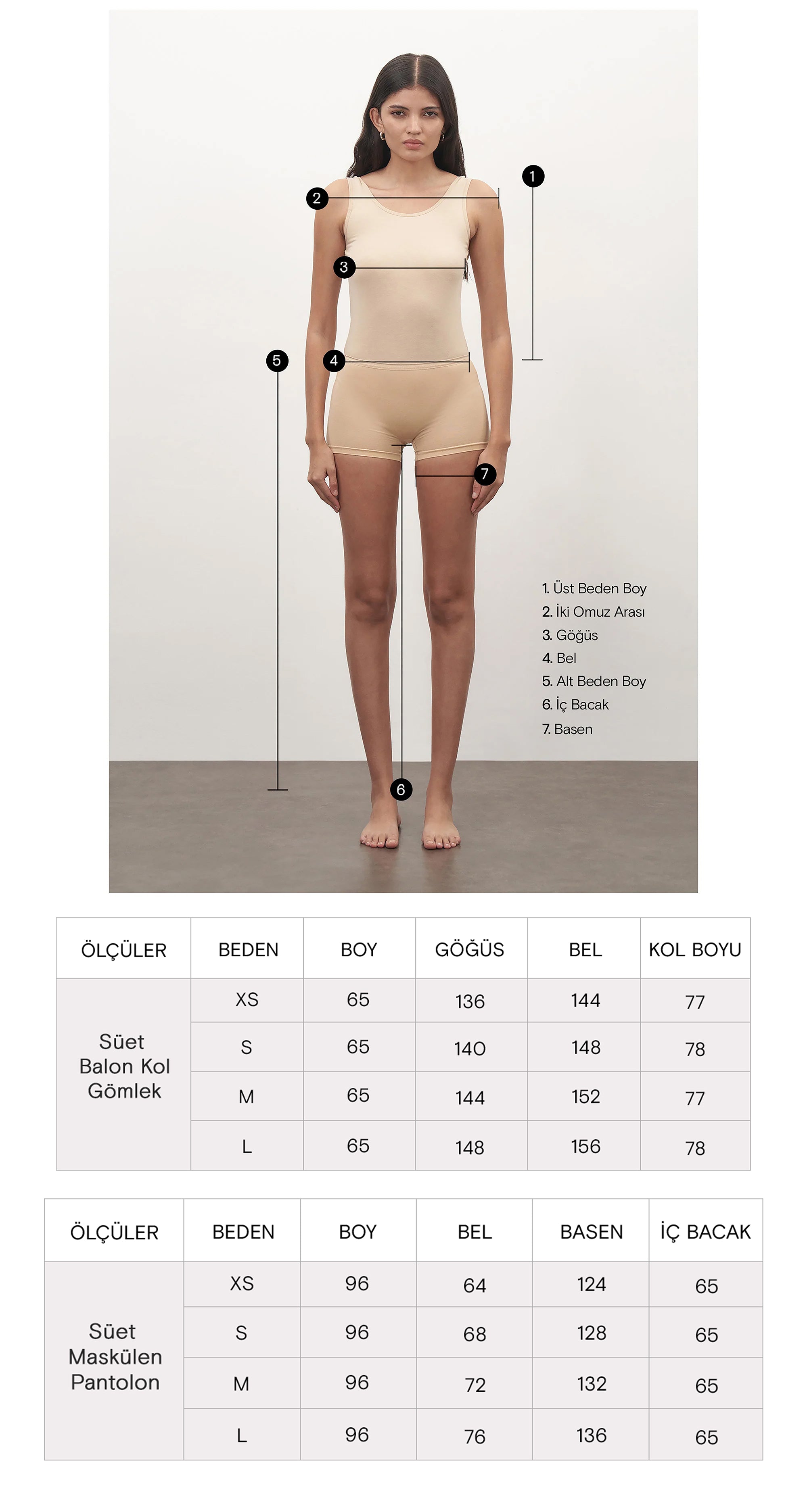 Süet Balon Kol Gömlek Pantolon takım , Gömlek ve Pantolon olarak iki parçadan oluşmaktadır.