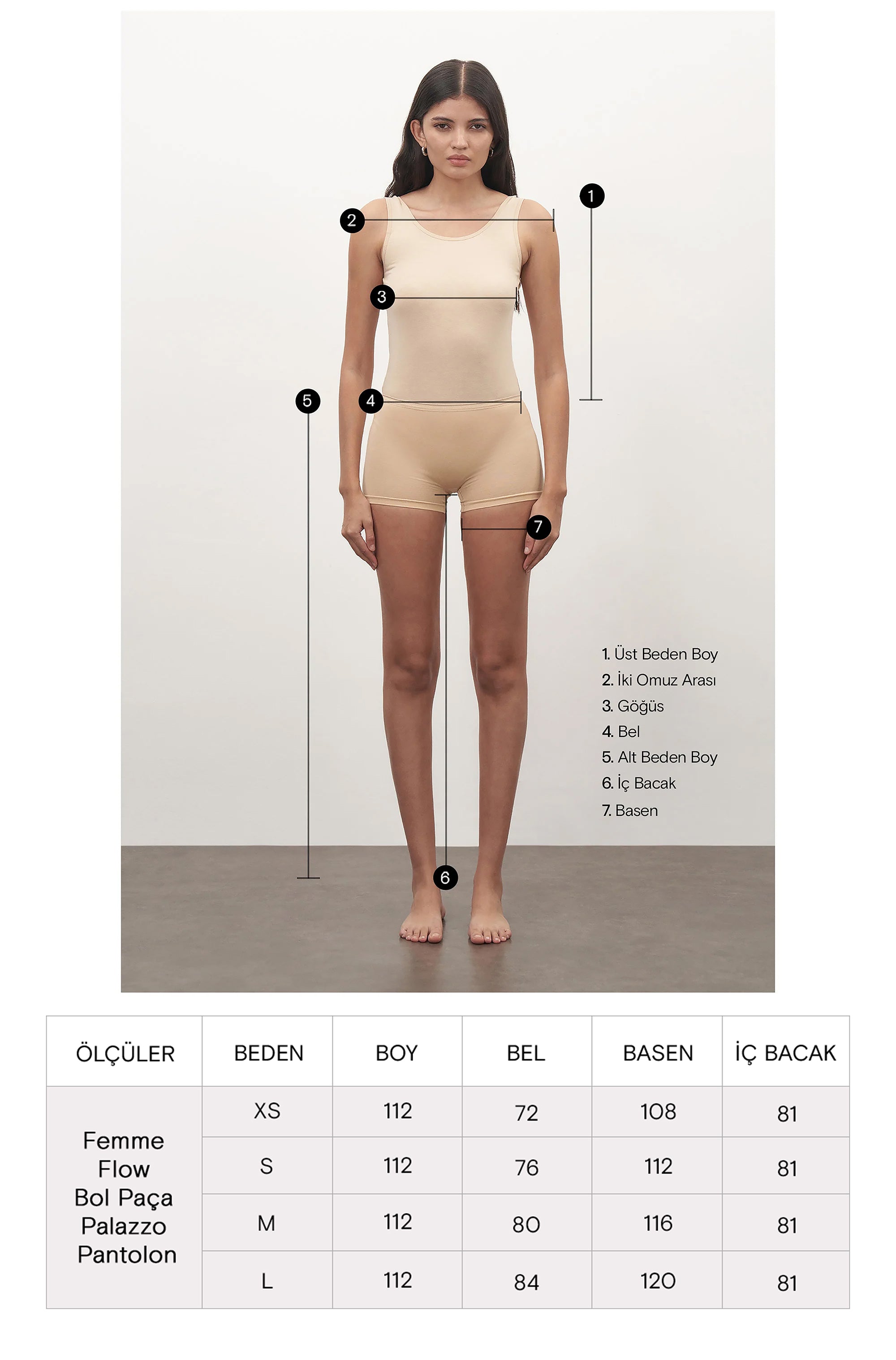 Yüksek bel form, geniş paça, kemer köprülü, iki yan cep, bir arka süs cep ve 112 ölçüsüne sahiptir.