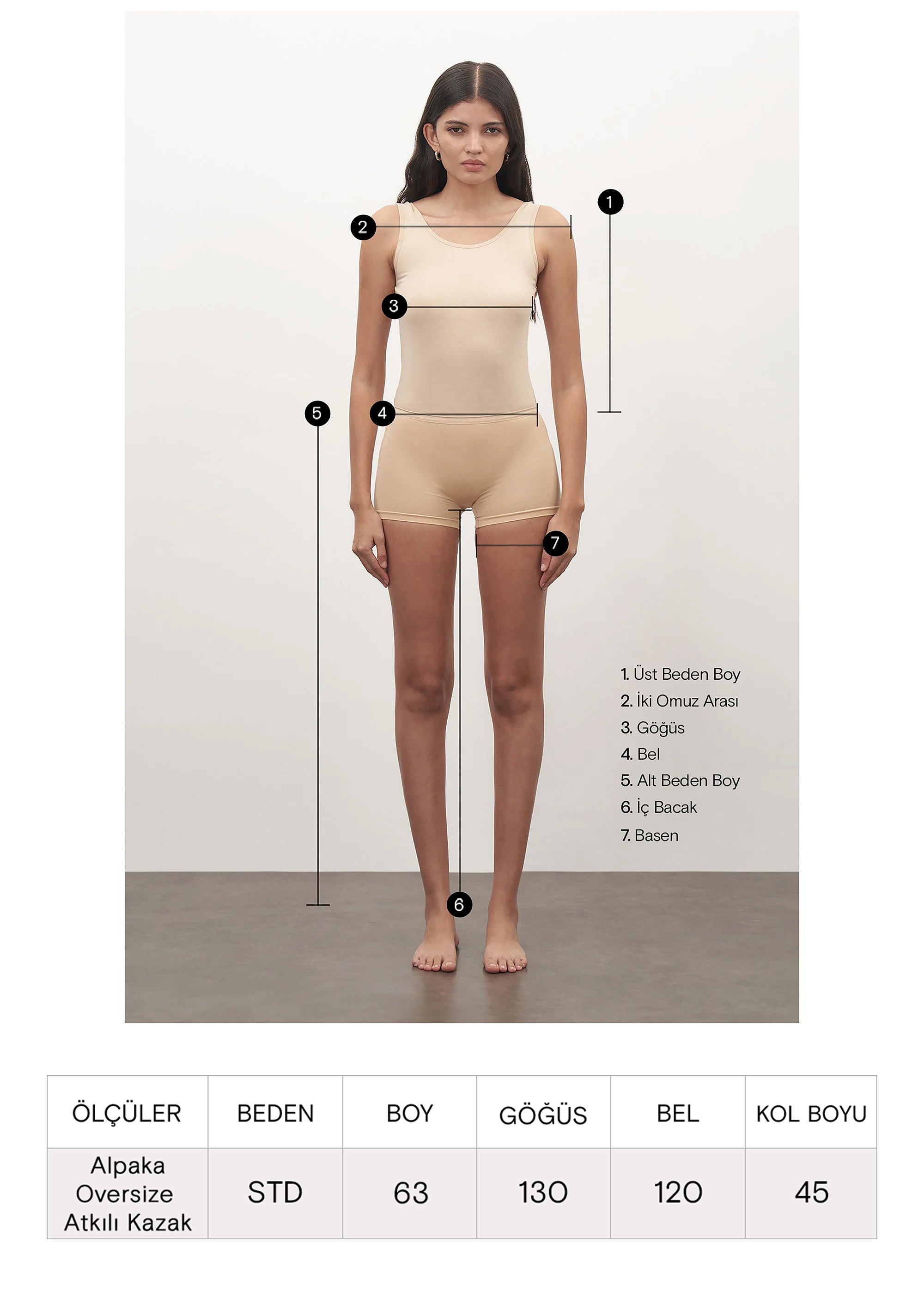 Uzun kollu, bisiklet yakaya sahiptir ve 63 cm boy ölçüsündedir. Atkısı ürüne dahildir; atkı boyu 240 cm’dir.
