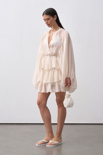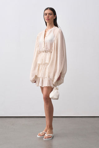 Transparan ve dökümlü yapısıyla yaz sezonuna ferahlık katan bu gömlek, beli lastikli formuyla vücuda uyum sağlar. Bisiklet yaka, balon kol ve önden düğme kapamalı tasarımıyla zarif ve hareketli bir siluet sunar. 56 cm boy uzunluğundadır.
