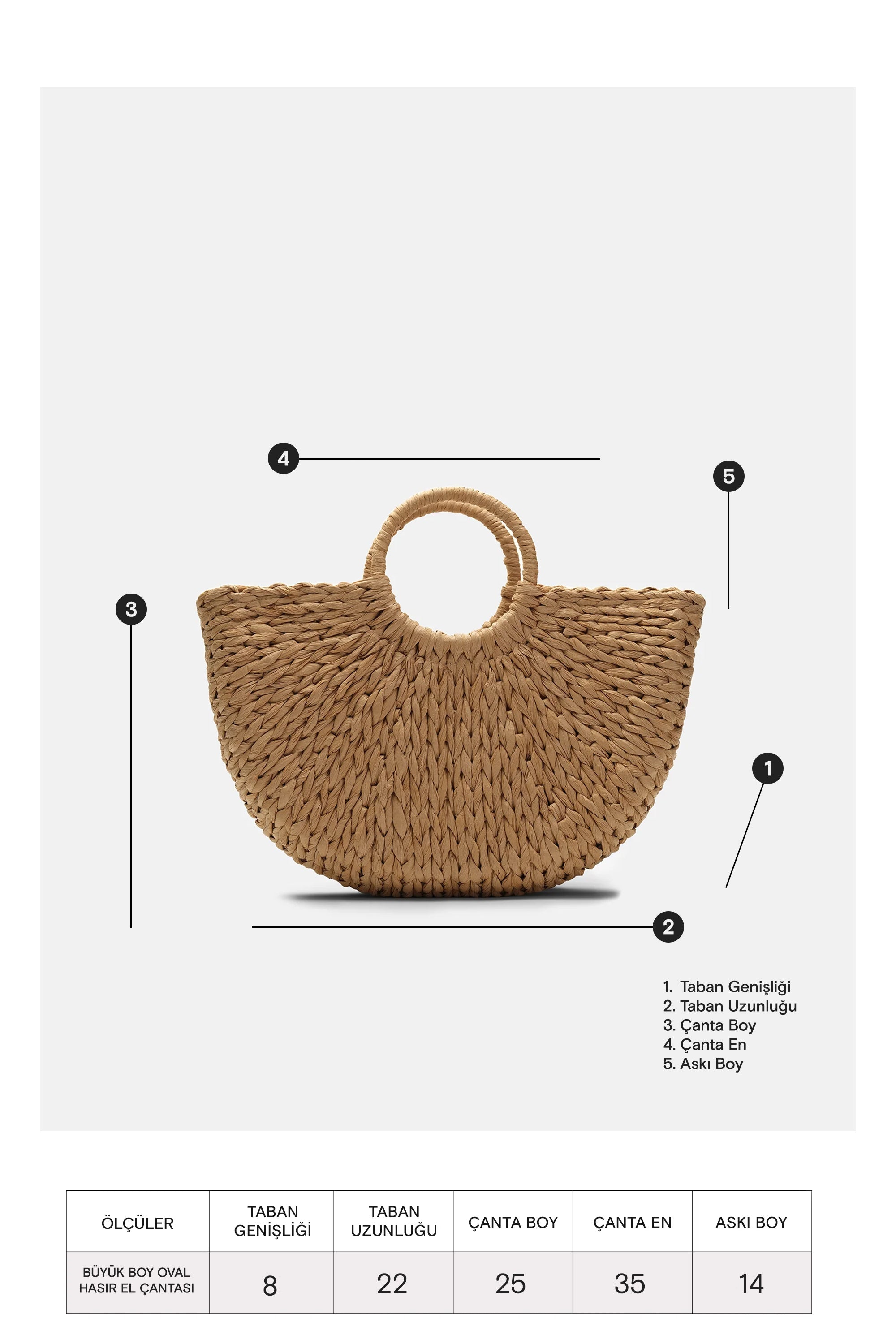 Fiber kumaş, içi astarlı, büyük boy, çift sap. İki kısa el kulplu, düğüm kapamalı Oval Hasır El Çantası.