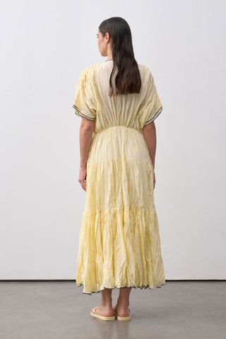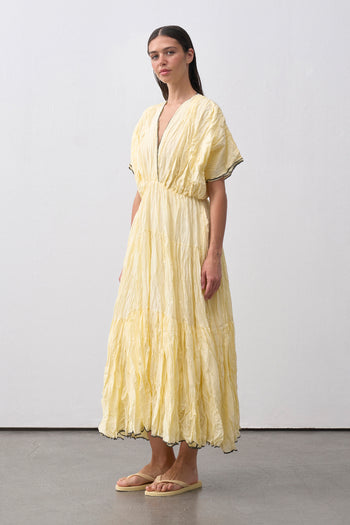 V yaka kesimi ve dökümlü formu ile zarif bir siluet sunan bu maxi elbise, kısa kollu yapısı ve kraş dokulu %100 pamuk kumaşıyla yaz sezonuna ferahlık katıyor. 134 cm uzunluğundadır ve uç kısımlarında kontrast biye detayı yer alır.