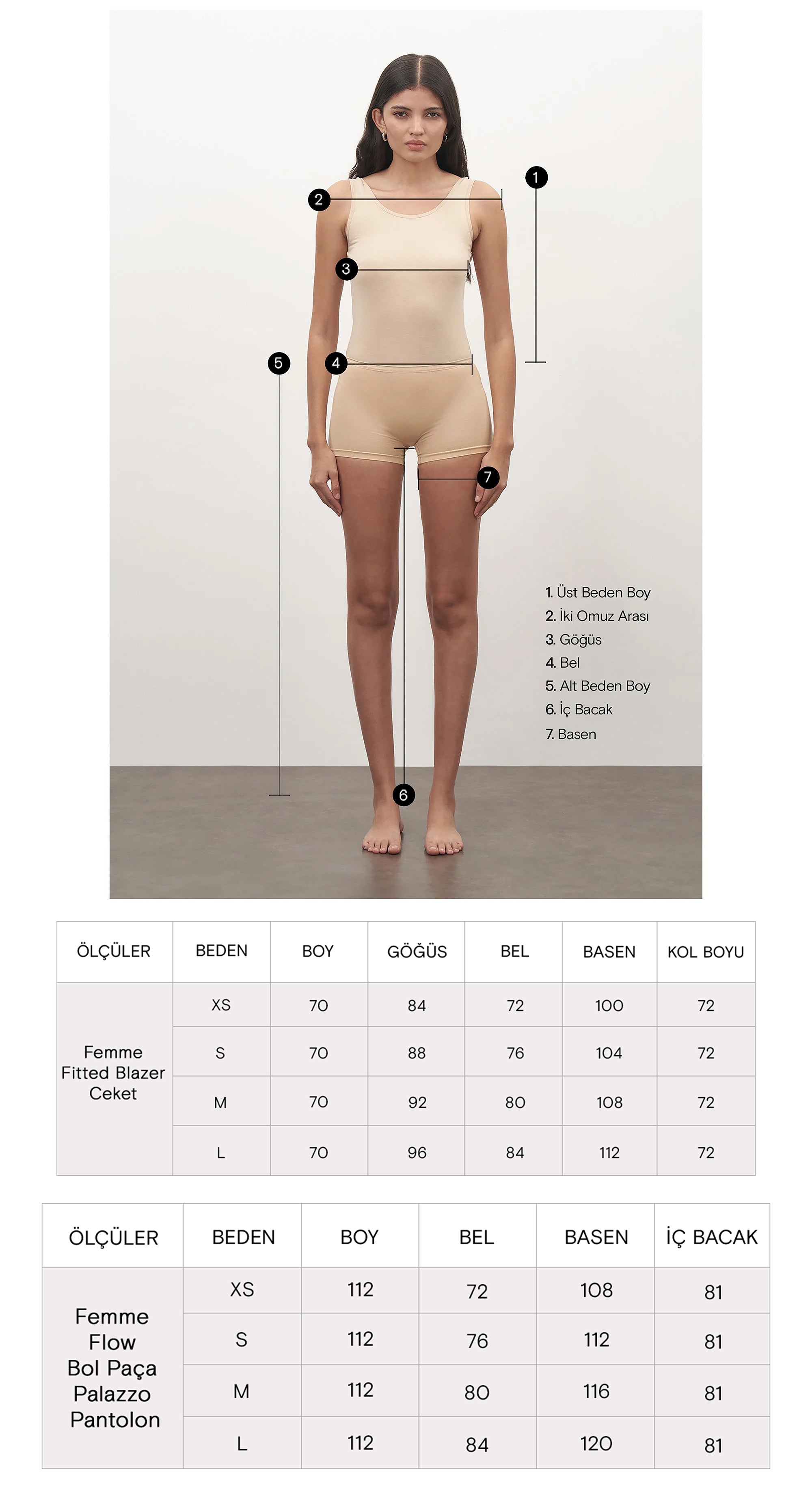 Femme Blazer Ceket Palazzo Pantolon Takım, Ceket ve Pantolon olarak iki parçadan oluşmaktadır.