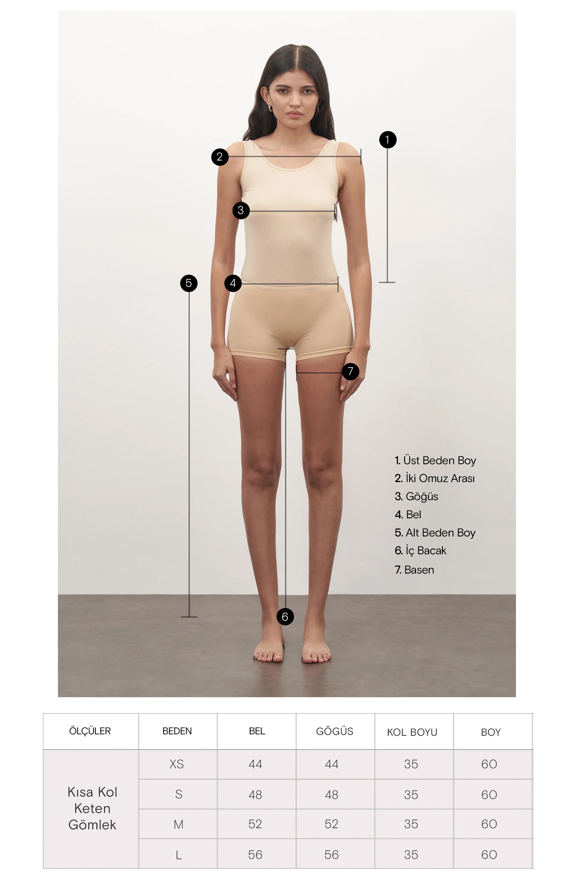 Kısa kollu, düğme kapamalı, ürün 60 cm boy ölçüsüne sahiptir.