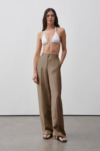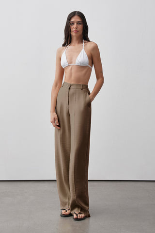 Yüksek bel form, geniş paça, bel lastikli, fermuar kapamalı, iki yan cep ve 115 cm boy ölçüsüne sahiptir.