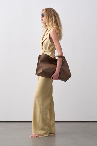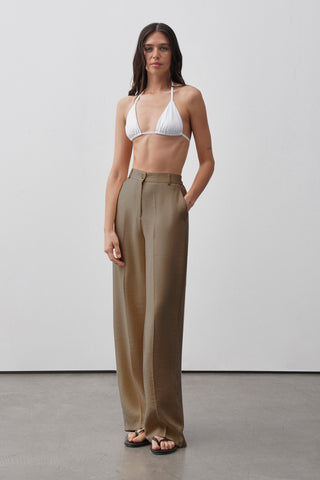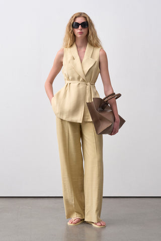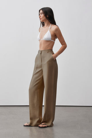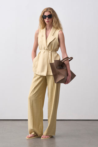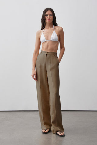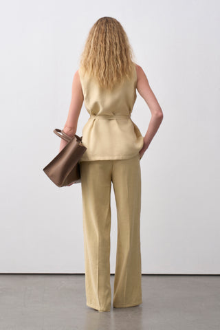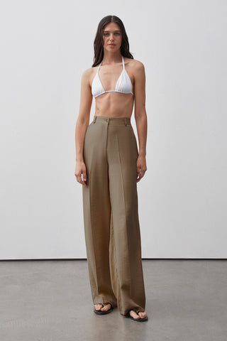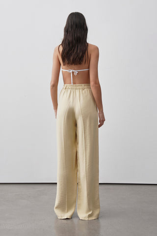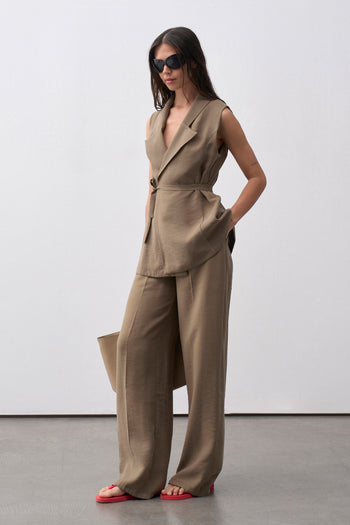 Yüksek bel form, geniş paça, bel lastikli, fermuar kapamalı, iki yan cep ve 115 cm boy ölçüsü