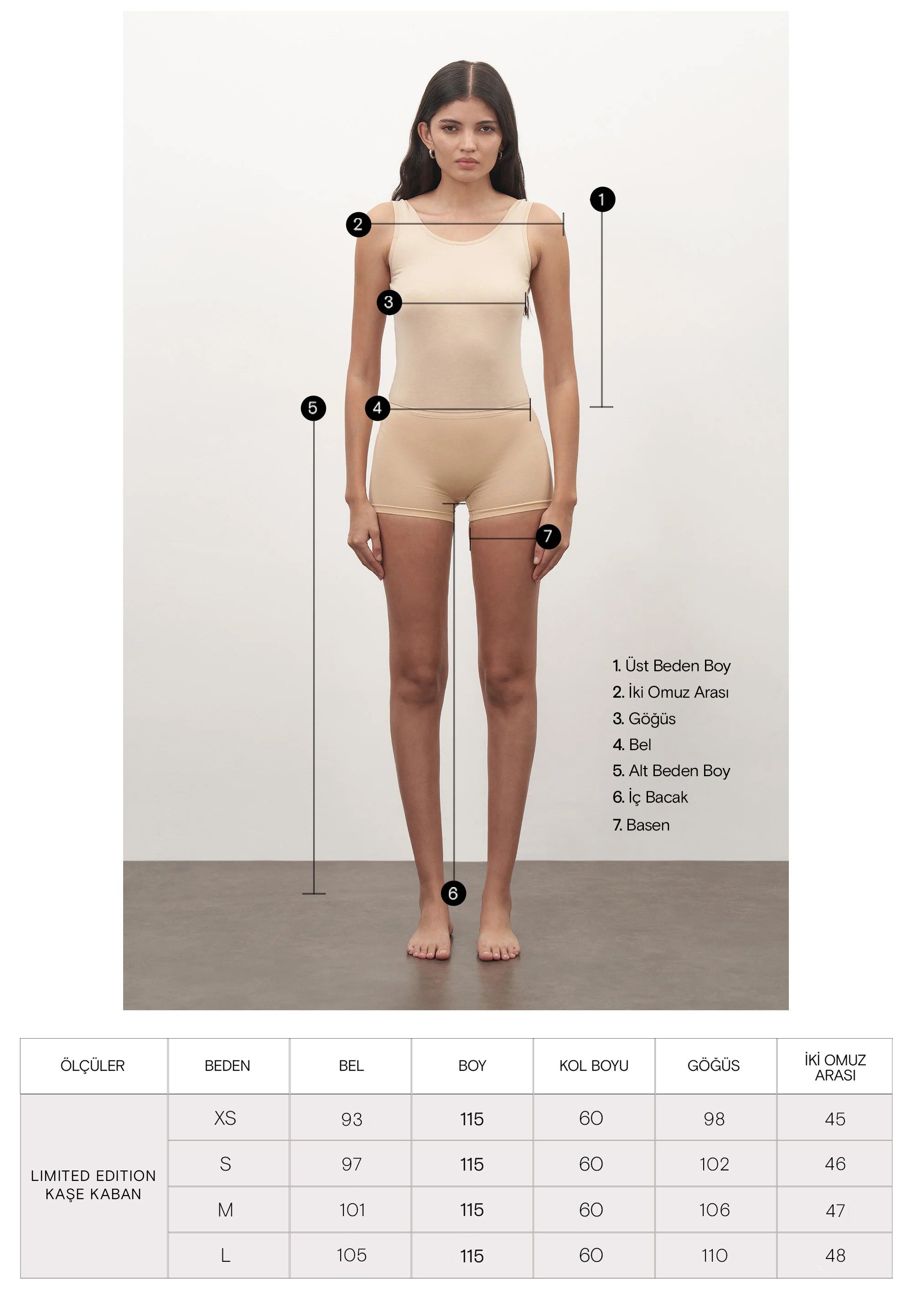 Uzun kollu, yarım vatkalı, arkası yırtmaç detaylı, iki yan cepli ve 115 cm boy ölçüsüne sahiptir.