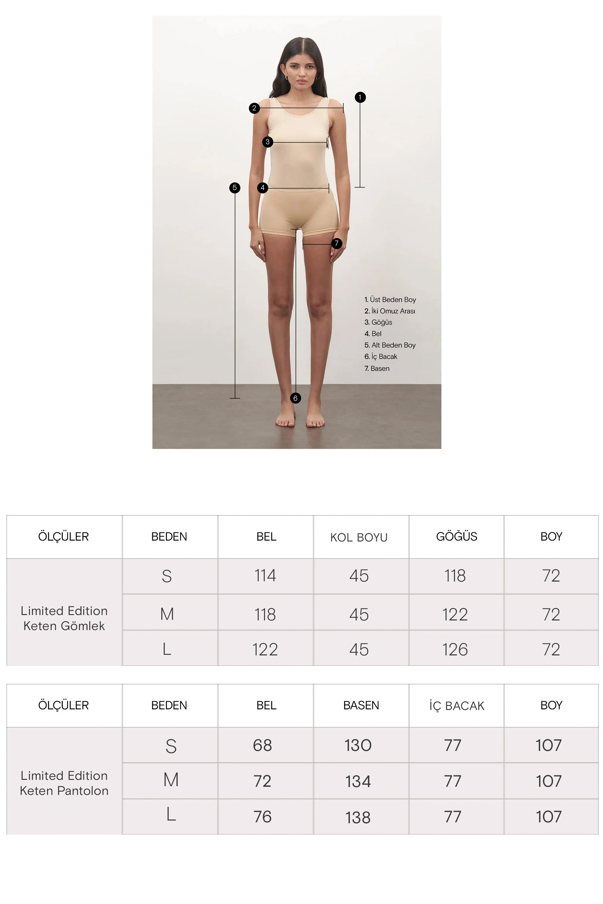 Model ölçüleri: Boy: 1.83 cm Göğüs: 82 cm Bel: 60 cm Basen: 89 cm
