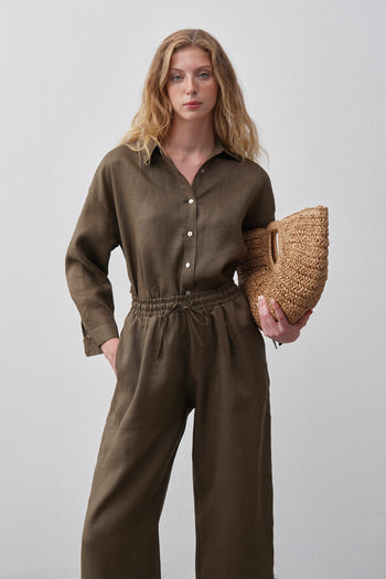 Yüksek bel form, geniş paça, iki yan cep, bir arka süs cep ve 107 cm boy ölçüsü