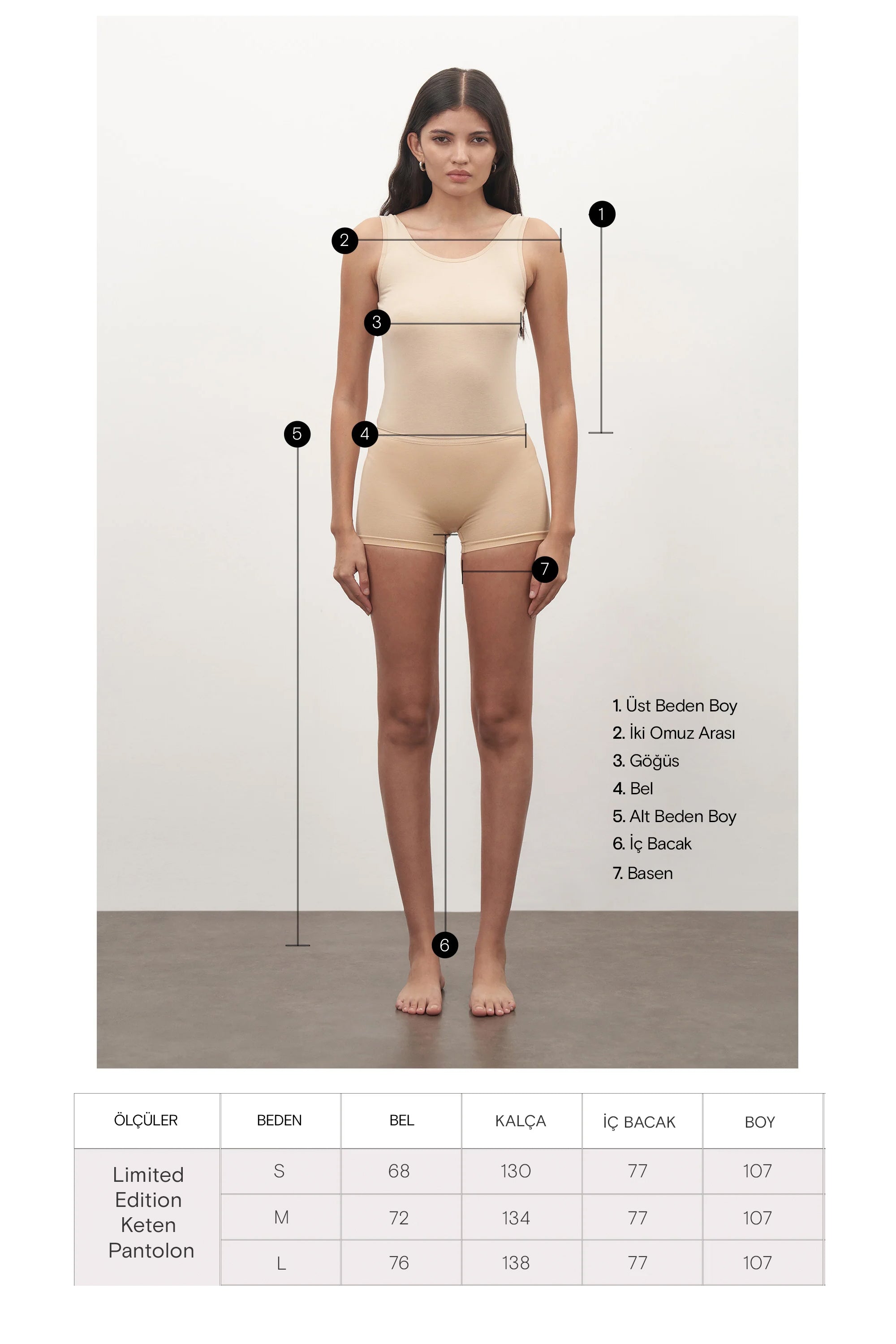 Yüksek bel form, geniş paça, iki yan cep, bir arka süs cep ve 107 cm boy ölçüsü