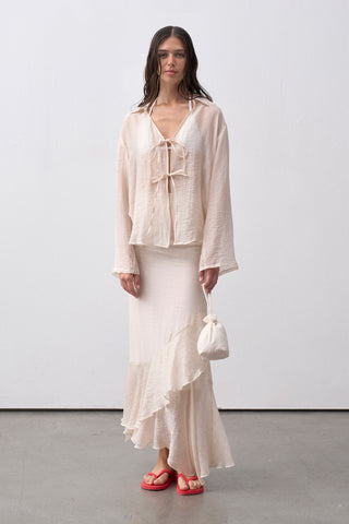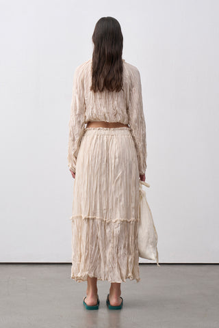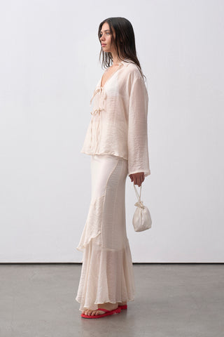 Yüksek bel form, yan fermuar kapamalı ve 104 cm boy ölçüsüne sahiptir.