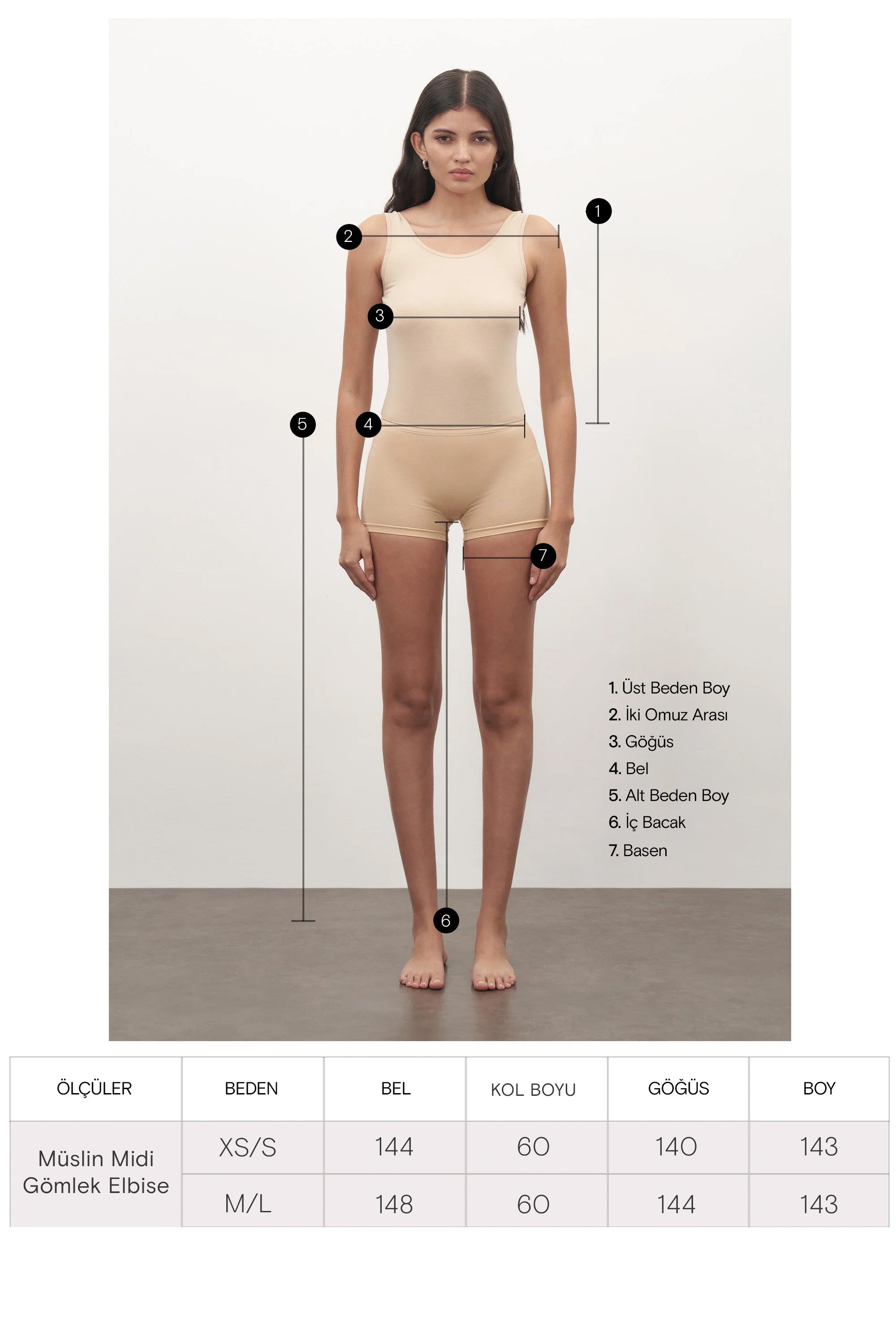 Model ölçüleri: Boy: 1.83 cm Göğüs: 82 cm Bel: 60 cm Basen: 89 cm