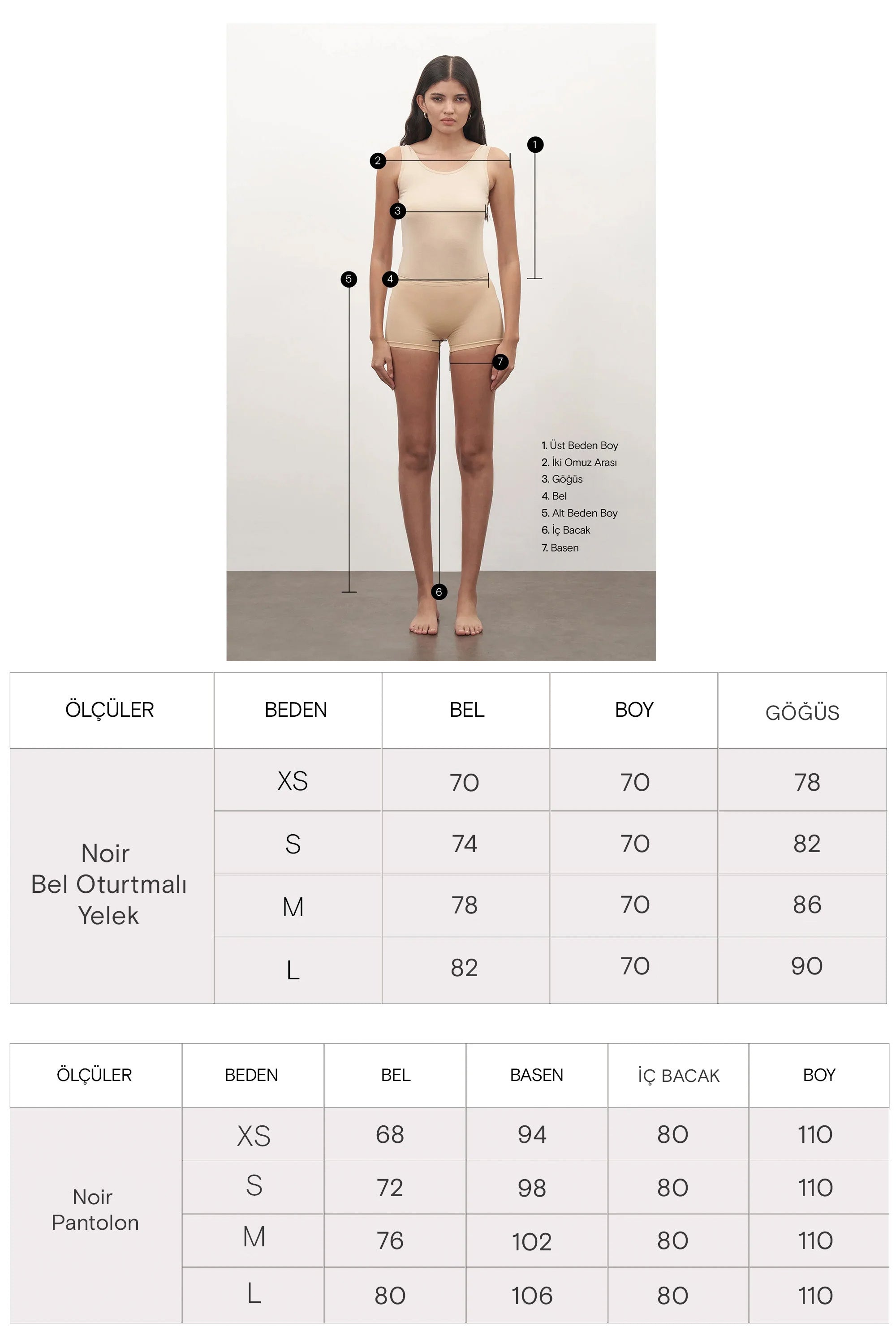 Noir Bel Oturmalı Yelek Palazzo Pantolon Takım, Yelek ve Pantolon olarak iki parçadan oluşmaktadır.