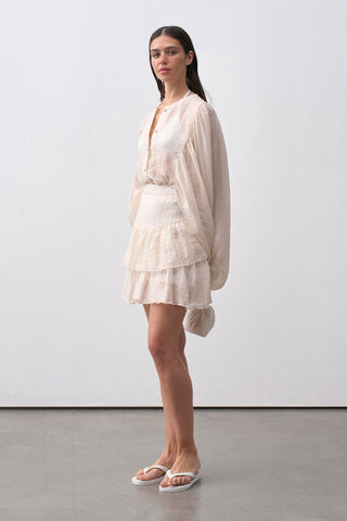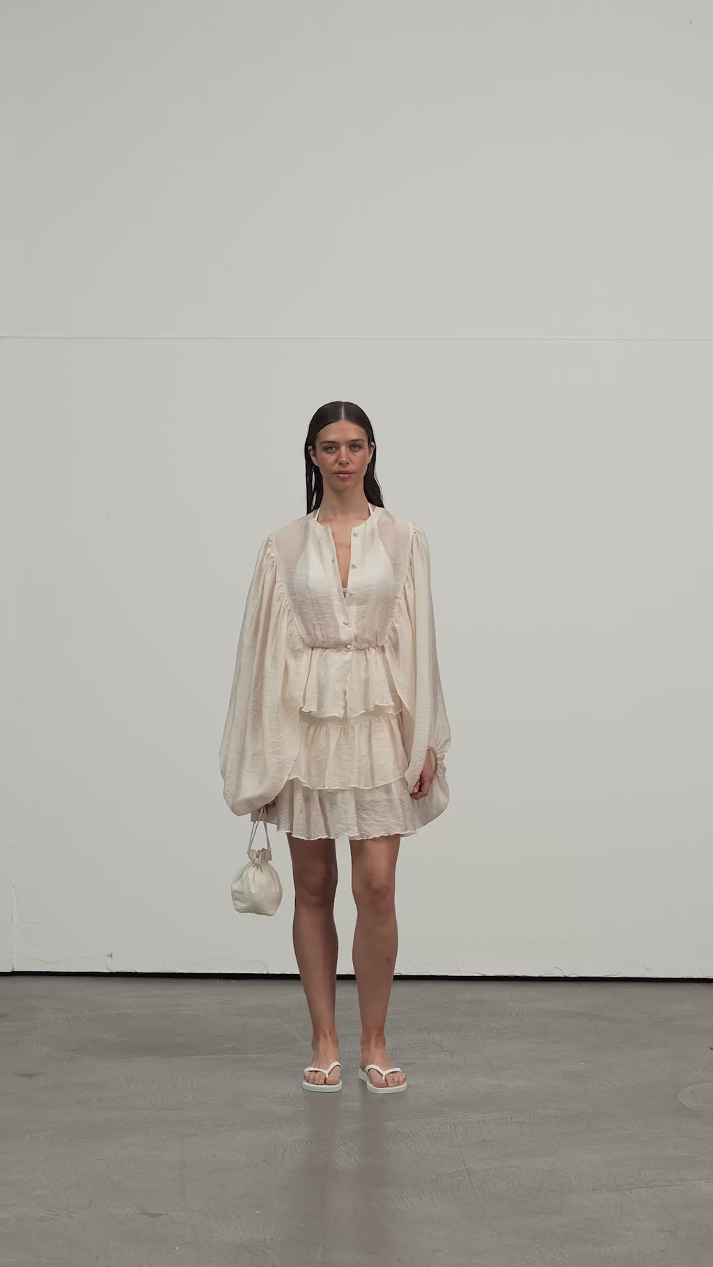Transparan ve dökümlü yapısıyla yaz sezonuna ferahlık katan bu gömlek, beli lastikli formuyla vücuda uyum sağlar. Bisiklet yaka, balon kol ve önden düğme kapamalı tasarımıyla zarif ve hareketli bir siluet sunar. 56 cm boy uzunluğundadır.