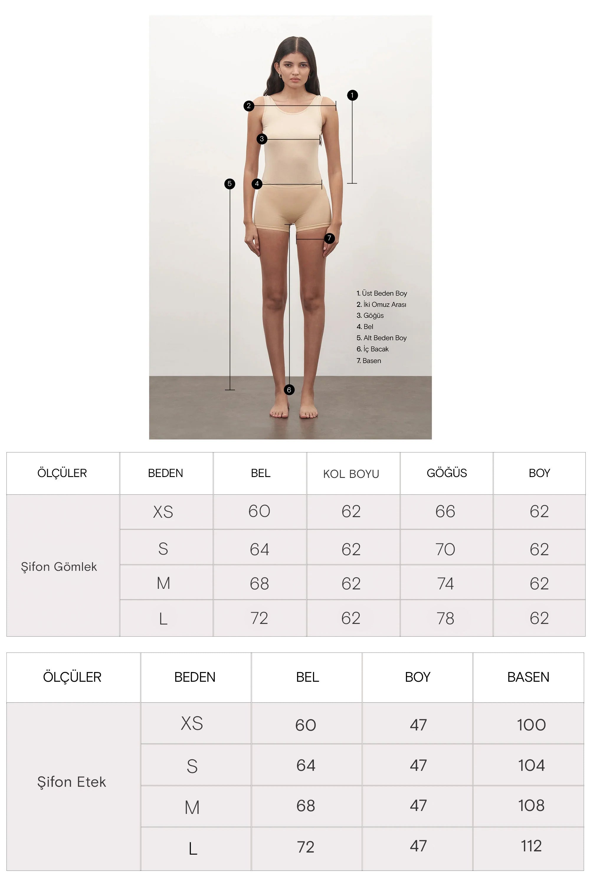 Şifon Gömlek Etek Takım, gömlek ve etek olarak iki parçadan oluşmaktadır.