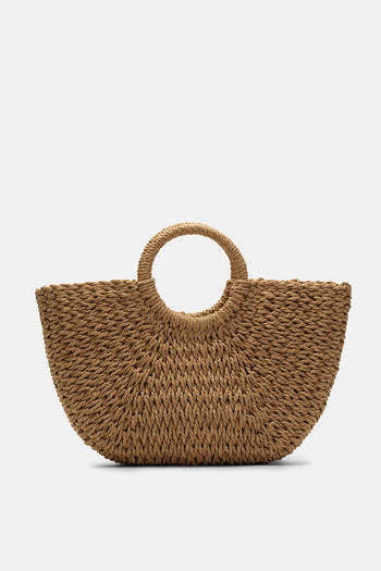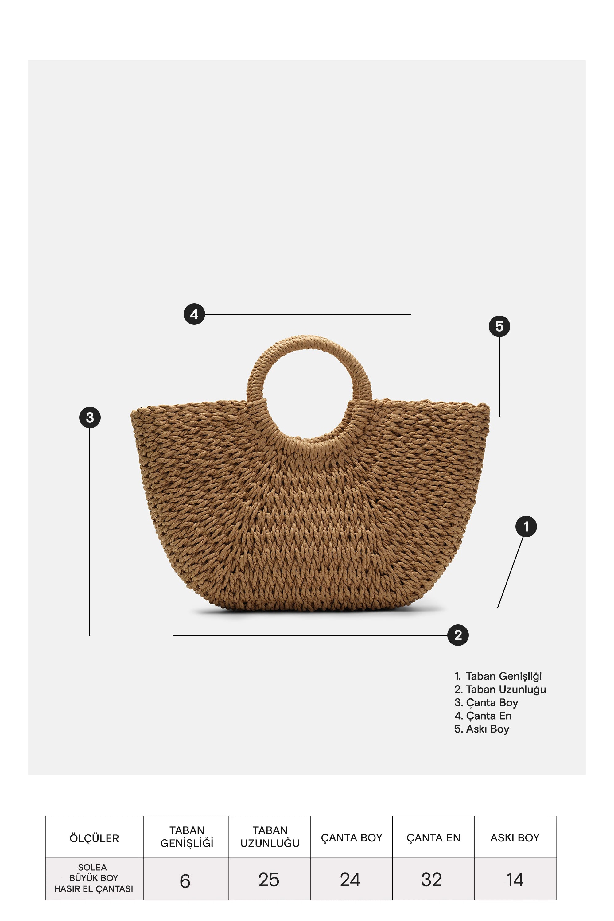 Fiber kumaş, içi astarlı, büyük boy, çıkarılabilir uzun çapraz askı, düğüm kapamalı Oval Hasır El Çantası.