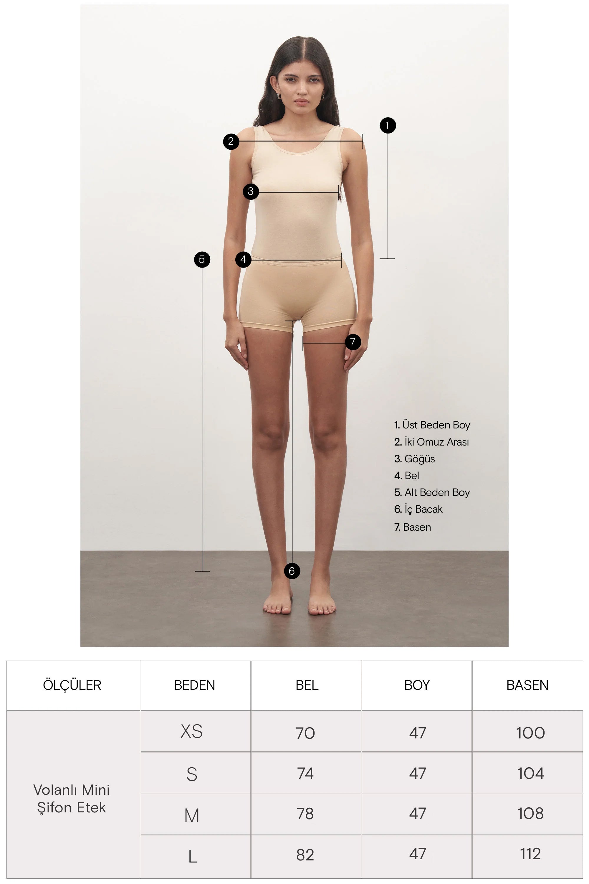 Dökümlü formuyla yaz stiline dinamizm katan bir mini etektir. Volan detayları sayesinde feminen ve enerjik bir siluet sunar. Fermuar kapamalıdır, astarlıdır ve konforlu bir kullanım sağlar.